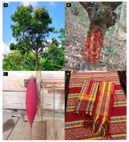 Since prehistoric civilization, plants have been used to maintain humanity’s basic life-sustaining needs, including food, fuel, and shelter, and have also been used for furniture, paper, cloth, and natural dyes [,]. The first written record of the use of natural dyes extracted from plants was found in China dating back to 2600 BCE [,]. Plant parts that have been utilized as dyestuffs include bark, flowers, fruit, leaves, rhizomes, roots, seeds, and the whole plant [,,,,]. Other biological sources, such as fungi, lichens, and animals, have also been used [,,]. Color plays a vital role in the interactions among humans, and the choice of color varies among people, depending on personality traits, color perception, motivation, culture, beliefs, and emotions [,]. Therefore, people use different plant materials from a variety of species to impart the desired colors depending on their interests. Substances, including alum, firewood ash, calcium carbonate, potassium bichromate, and lime, have been used as mordants to bind the dye to the fabric and make it colorfast, as well as to brighten the color [,,,]. Throughout history, people have been dyeing textiles using common, locally available materials. Dyes that produce brilliant colors (e.g., purple, blue, green, black, red, and yellow) were rarer and thus considered highly priced luxury items during the medieval period [], the Ming and Qing dynasties [], and most Egyptian eras [,]. Thus, plant species and the parts used for traditional textile dyeing can vary among communities, depending on their traditional clothes and the locally available plant species.