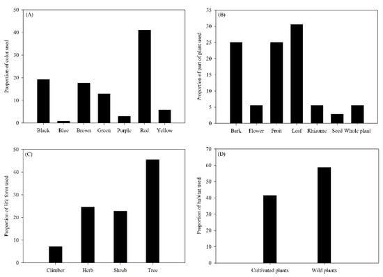 Leaves were the most used plant part for dye extraction for Lutuv-Chin fabrics and clothes. The predominant use of leaves has also been reported in Mizoram, India []. In contrast, the bark was the primary plant part used for dye extraction in Manipur, India [], and Southwestern China [], whereas trees were reported to be the most common life form for textile dyes in other studies [,,].