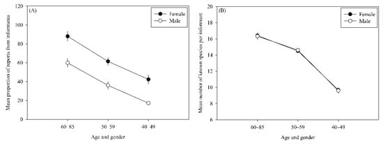Only 309 out of 2070 informants, including all towns and villages across different ages, had traditional knowledge of the textile dyeing method. There was a negative correlation between the traditional knowledge of the plants used for textile dyeing and the ages of the informants (Wald = 126.09; df = 2; p < 0.001). The younger generation had less knowledge of textile dyeing plants than the older generation (0.74 ± 0.03 for age ≥ 60, 0.49 ± 0.03 for the age of 50 to 59, and 0.30 ± 0.03 for 40 to 49; Figure 5A). There was a significant difference in the traditional knowledge of textile dyeing with plants between genders (0.64 ± 0.02 for female; 0.37 ± 0.02 for male; Wald = 66.437; df = 1; p < 0.001), but the interaction was not significant (age × gender: Wald = 0.164; df = 2, p = 0.921).