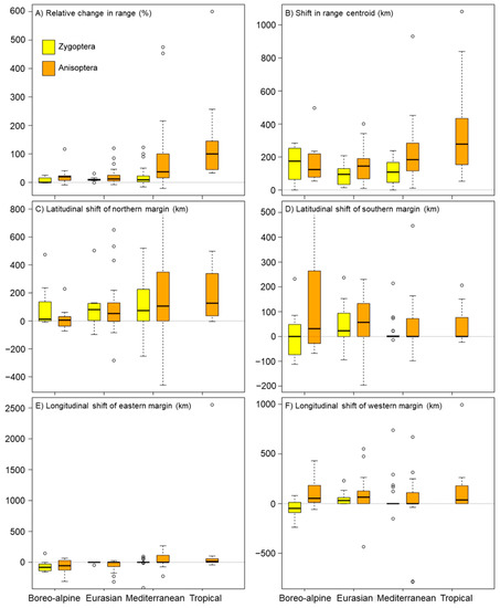 Range shifts in European dragonfly (Odonata) species from 1988 to 2010. (A) Relative change in range (percent change in number of occupied 100 × 100 km grid cells). (B) Distance shift of range centroid. (C) Latitudinal shift of northern range margin. (D) Latitudinal shift of southern range margin. (E) Longitudinal shift of eastern range margin. (F) Longitudinal shift of western range margin. Data separated by biogeographical groups (Tropical, Mediterranean, Eurasian, and Boreo-alpine) for damselflies (Zygoptera, yellow) and true dragonflies (Anisoptera, orange). The box-and-whisker plots illustrate the spread and skewness of the data through their quartiles and the median (thick black middle line). The whiskers extending from the box show data variability outside the upper and lower quartiles. Outlier points that differed significantly from the rest of the dataset are plotted as individual points (empty circles) beyond the whiskers.
