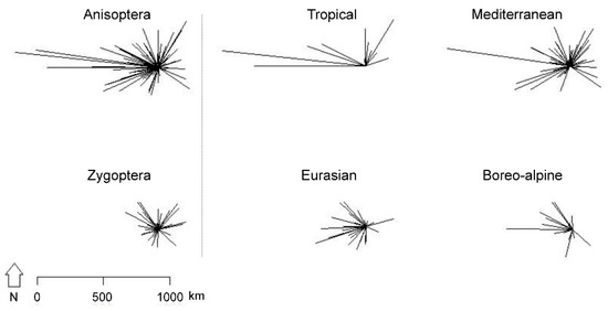 Tropical species highlight the colonization corridors for Afro-Tropical species entry into southern Europe, by crossing the narrowest straits of the Mediterranean Sea through the Iberian or Italian peninsulas, by using Mediterranean islands as stepping stones, or through the Near East. Although the initial colonization of Europe occurred as northbound movement from Africa [75], it is important to note that the colonization did not immediately follow a direct northerly route. When species have crossed the Mediterranean Sea, they may occur in fragmented ranges with populations scattered along various southern latitudes. Increase in range and subsequent colonization by these subpopulations means that the direction in their range shift appears stochastic rather than following a recognizable pattern. This appearance is illustrated by the tropical species Paragomphus genei, which had the largest change in range centroid in a 1081-km shift westward, resulting from recent range expansion across the Iberian Peninsula, where the species has begun to reproduce in watering pools constructed for sheep [76]. This example offers a possible explanation for why, in contrast to expectations, shift patterns in range centroid and overall range were mixed. Expanding species had an overall northbound directionality in their range expansion, and we expected this trend to manifest not only at the northern range boundary but also in the direction of range centroid shifts. However, as the plots illustrate (Figure 2), there was no common directionality because of differences in habitat requirements, habitat dispersal abilities, knowledge in distribution and other factors [22]