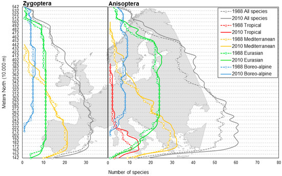 For our work here, we used distribution maps of European dragonflies from 1988 [49] and 2010 [34] to identify how their species ranges have changed during those 22 years. Our scope was to track temporal changes in distribution and to highlight patterns in the latitudinal and longitudinal movements at the margins of the dragonfly ranges. For this purpose, we analyzed geographic patterns of change in species richness with the aim of identifying species groups sharing functional and biogeographic traits that primarily drive local turnover in species assemblages and cause geographical shifts in species richness patterns. The five specific questions we addressed are as follows: (1) Are increases in ranges of true dragonflies greater than those of damselflies? (2) Have the ranges of southern species increased more than the ranges of continental and northern species? (3) Will northern species and high-elevation species experience reduced overall ranges as their realized climatic envelopes shrink because of global warming? (4) Are northwards range shifts greater than movements at other range margins reflecting a directional poleward shift rather than a non-directional range expansion? (5) Are geographical shifts in species richness patterns driven mainly by southern species rather than by species from a more continental and northern origin? We argue that these measures would be particularly useful for detecting effects of environmental changes and highlighting the importance of using insects—and especially dragonflies—as first-level indicators of environmental health. We expect the current findings to support conservation efforts by providing additional means of determining species and species groups most at risk.