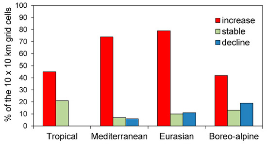 The geographic pattern of changes in local species richness differed among biogeographic groups (Figure S1), which followed variation in the percentages of 10 km × 10 km grid cells in which the number of Tropical, Mediterranean, Eurasian, or Boreo-alpine species increased, decreased, or remained unchanged between 1988 and 2010. The Boreo-alpine group showed the largest decline in the percentage of 10 × 10 km grid cells where species from that group occurred in 1988 compared with the similar decline in species from Tropical, Mediterranean, and Eurasian groups. In contrast, the Mediterranean and Eurasian species showed the largest percentage of cells with increasing diversity (Figure 5).