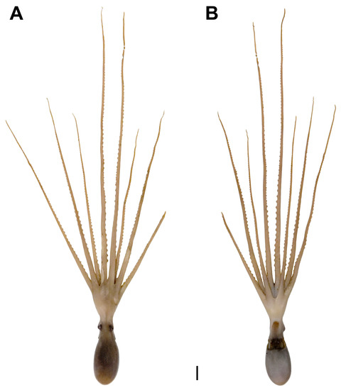Callistoctopus tenuipes sp. nov. (OUC-201812050307). (A). Dorsal view; (B). ventral view. Scale bar = 10 mm.
