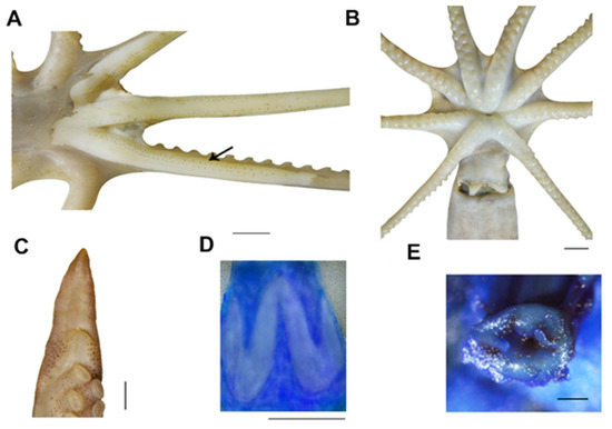 Colouration: Fresh specimens reddish orange. Skin smooth with no papillae on dorsal mantle. Two or more lines of chromatophores obviously presented on the lateral margins of arms under the skin (Figure 4A).