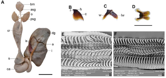 Chitinous beaks dark brown. Upper beak (Figure 5B) with short hood, sharp and small rostrum. Crest curved and longer than total wing length. Lower break (Figure 5C,D) with a medium-sized hood, moderate broad wings, and short lateral wings. Radula (Figure 5E,F) with seven teeth and two marginal plates per transverse row. Rachidian teeth with two or three lateral cups on each side. First lateral teeth small and sharp. Second lateral teeth larger than the first, sharp. Third lateral teeth long, curved, sharply pointed, longer than second lateral teeth. Marginal plates flat.