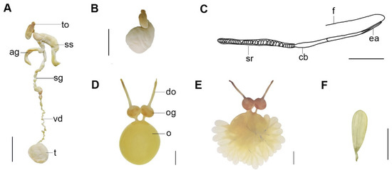 Callistoctopus tenuipes sp. nov. (A,B). Male reproductive tract (OUC-201812050310); (C). spermatophore (OUC-201812050310), (D). female reproductive tract (OUC-201812050312), (E,F). eggs (OUC-201812050312). Scale bars: (A–F) = 10 mm. Abbreviations: ag, accessory gland; cb, cement body; do, distal oviduct; ea, ejaculatory apparatus; o, ovary; og, oviducal gland; sg, spermatophore gland; sr, sperm reservoir; ss, spermatophore storage sac; t, testis; f, filament; to, terminal organ (penis); vd, vas deferens.