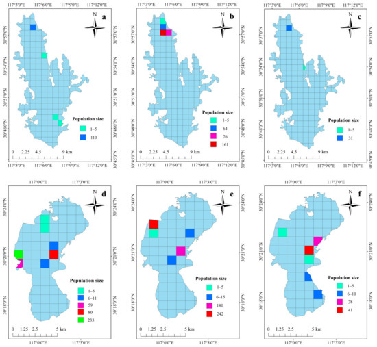 Spatio-temporal distribution of Hooded Cranes population in different wintering periods. (a–c) at Caizi Lakes and (d–f) at Shengjin Lake, presented the crane individuals in the kilometer grids in the early, middle, and late wintering periods.