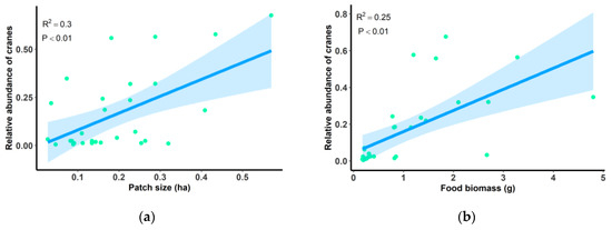 General linear regression between relative abundance of cranes and (a) patch size (ha) and (b) food biomass (g). (Blue areas represent 95% confidence intervals).