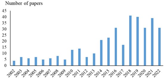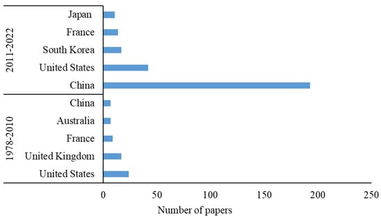 Together with an increase in the number of papers, the leadership among the countries on this topic also changed, and from 2011–2022, China took a leading position (Figure 2).