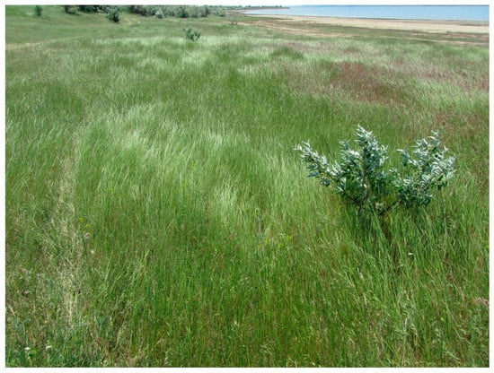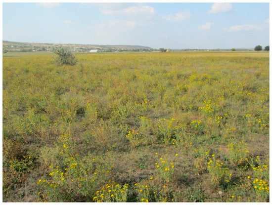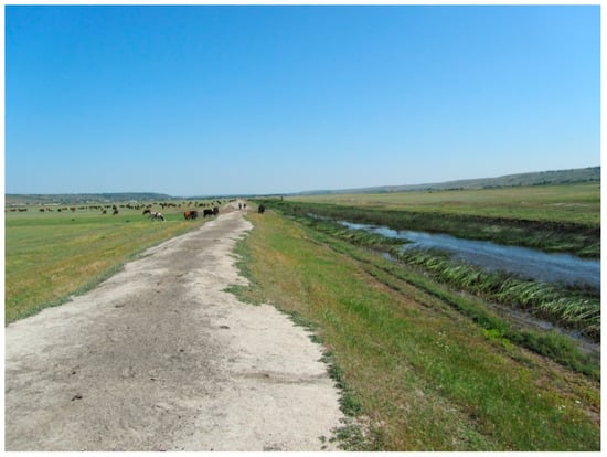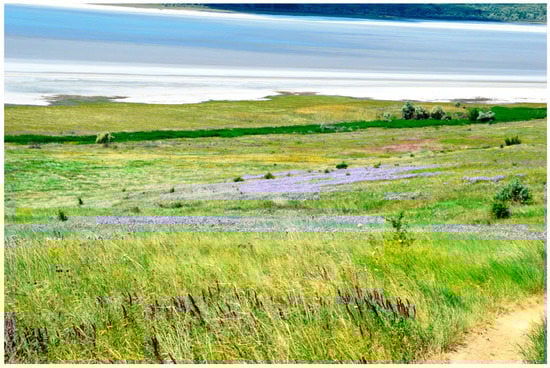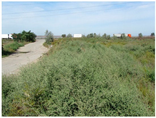 45]. A decrease in the river flow, up to its complete cessation, and prolonged summer droughts resulted in their excessive drainage and salinization. These lands, with a loss of fertility, were abandoned and turned into low-productive pastures. Restorative successions of their vegetation occur in the direction of the formation of salt meadows. Field areas abandoned one or two years ago are overgrown with ruderal species