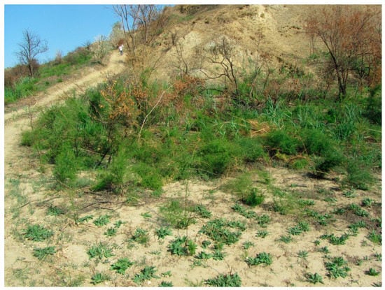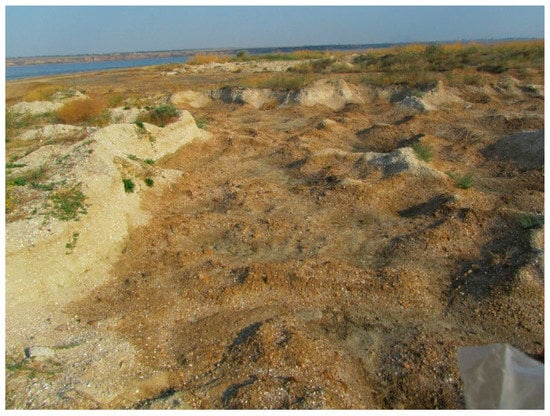 28]. These geosystems have historically played an extremely important role as biogenetic reserves and, at the same time, they act as ecological corridors for the exchange of diasporas of florocenotic complexes in the western and eastern areas of the northern Black Sea region. Their destruction and, accordingly, the destruction of vegetation has become a disaster not only for this local territory, but it also negatively affected the state of vegetation cover of the entire region because of the interruption of biogeographic links. The disruption caused by sand and shell rock quarry extraction in this area also breaks the biogenetic links of coastal littoral vegetation of the Black Sea-Caspian region. Ruderal species, such as