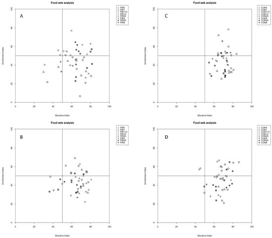 The FIR sites affected by high severe fires had 50% of samples collected immediately and 1 year after the event in quadrat A and D, following the weighted faunal analysis by Ferris et al. (2001), and the food web was characterized as stressed or highly disturbed (Figure 1A), consistent with the mean EI and SI values (Table 3). In contrast, all samples from the control plots are depicted in quadrats B and C, which represent a maturing or structured food web, low to moderate disturbance, and balanced/fungal decomposition of organic matter (Figure 1C). The majority of samples collected from sites affected by fires of low severity, as well as their controls are depicted in quadrats B and C, suggesting few impacts of slight burn on nematode communities (Figure 1B,D).