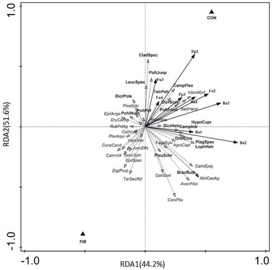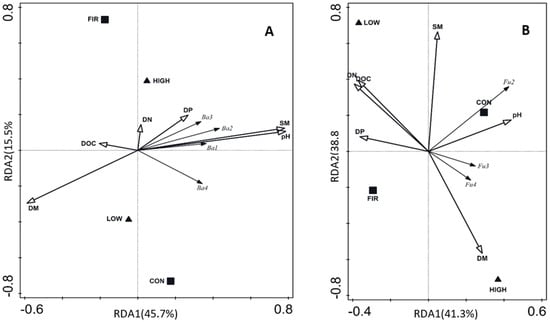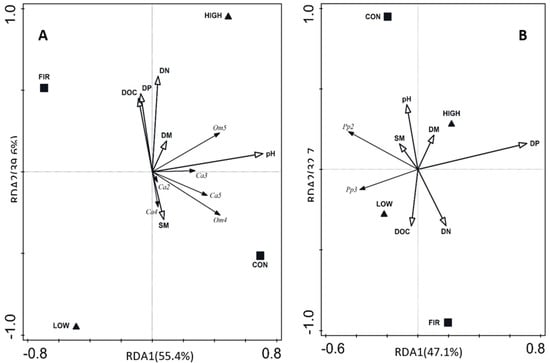 A redundancy analysis (RDA) was used on the nematode functional guilds of particular trophic groups for the fire severity, with explanatory variables soil pH, soil-moisture content, dry matter, DOC, DN, and DP to identify the relationships between the functional guilds and soil properties. Additionally, RDA was used on the bacterivorous, fungivores, and plant parasitic nematode functional guilds and vegetation characteristics to identify the relationships between those guilds and dominant plant species (trees, herbs, and mosses layers) on study plots. All data were log-transformed before use. The effects of the explanatory variables were quantified by automatic forward selection. These ordination analyses were performed in Canoco 5 for Windows [].