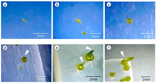 After 3 months of incubation, the number of seeds was counted under a stereomicroscope. Seed development was classified as follows: stage, 0 no germination (Figure 1a); stage 1, an enlarged embryo with ruptured seed coat (Figure 1b); stage 2, a globular embryo (protocorm) with rhizoids (Figure 1c); stage 3, a protocorm with an apical meristem (Figure 1d); stage 4, emergence of the first leaf (seedling formation) (Figure 1e); and stage 5, a seedling with a second leaf and further development (Figure 1f). The seed germination (%) per stage was calculated using the following formula: Percentage seed germination = (number of seeds per germination stage ÷ total number of viable seeds) × 100. The germination stage corresponded to stage 2 and above. The standardized growth index (GI) modified from Spoerl (1948) [] was calculated as follows: GI = (N1 + N2 × 2 + N3 × 3 + N4 × 4 + N5 × 5) ÷ (N0 + N1 +N2 + N3 + N4 + N5), where N0 is the number of seeds at stage 0, N1 is the number at stage 1, etc. []. The GI can range from 0 (no seeds germinated) to 5 (all seeds reached the seedling stage).