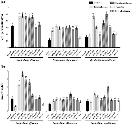 (a) Seed germination (%) and (b) seedling growth index (GI) of fungal isolates on Dendrobium officinale (Dof), D. okinawense (Dok) and D. moniliforme (Dmo) at 3 months after symbiotic culture. The host orchid is indicated after the fungal isolate name. Data are means of five replicates; bars indicate standard errors. Different letters denote significant differences according to the Tukey-Kramer test at the p < 0.05 level.