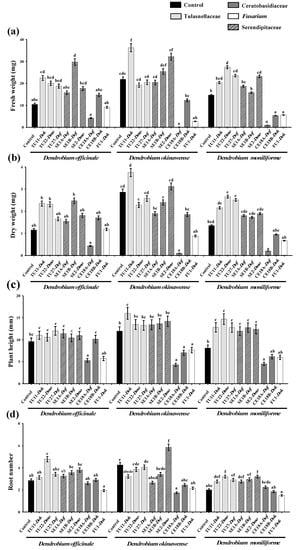 Seedling growth of D. officinale, D. okinawense, and D. moniliforme seedlings differed according to fungal strain (Figure 3 and Supplementary Figure S1). In D. officinale, seedlings inoculated with SE1B showed the highest fresh and dry weights with a significant difference in fresh weight seen compared with the other types of seedlings (Figure 3a,b). The number of roots was greatest after TU22 inoculation (Figure 3d). For D. okinawense, TU11 inoculation significantly increased the fresh weight and plant height and resulted in the highest dry weight (Figure 3a–c). Seedlings cultured with SE2 had the largest number of roots (Figure 3d). In D. moniliforme, TU22 significantly increased fresh weight, dry weight, plant height, and root number (Figure 3). TU27 and SE2 also increased seedling fresh weight, plant height, and leaf number (Figure 3a,c and Supplementary Figure S1).