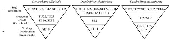 Three Dendrobium species showed a growth bottleneck during seed germination, and the fungal isolates that affected protocorm growth and seedling development varied among them (Figure 4). A variety of fungal isolates stimulated seed germination, but few promoted protocorm and seedling development (Figure 4). Five isolates (TU22, TU27, SE1A, SE1B, and SE2) contributed to D. officinale seed germination, four of which (TU22, TU27, SE1A, and SE1B) increased the GI value (Figure 2). However, only SE1B significantly increased seedling fresh weight (Figure 3a). Decreasing fungal diversity during development was found in D. moniliforme: five isolates (TU22, TU27, SE1B, SE2, and CE18A) promoted seed germination, whereas two (TU22, and SE2) and three (TU22, TU27, and SE2) isolates promoted protocorm growth and seedling development, respectively (Figure 2, Figure 3 and Figure 4). The largest bottleneck was in D. okinawense: eight fungi (TU11, TU22, TU27, SE1A, SE1B, SE2, CE18A, CE18B) promoted seed germination, but only one (SE2 or TU11) accelerated protocorm and seedling development (Figure 2, Figure 3 and Figure 4).