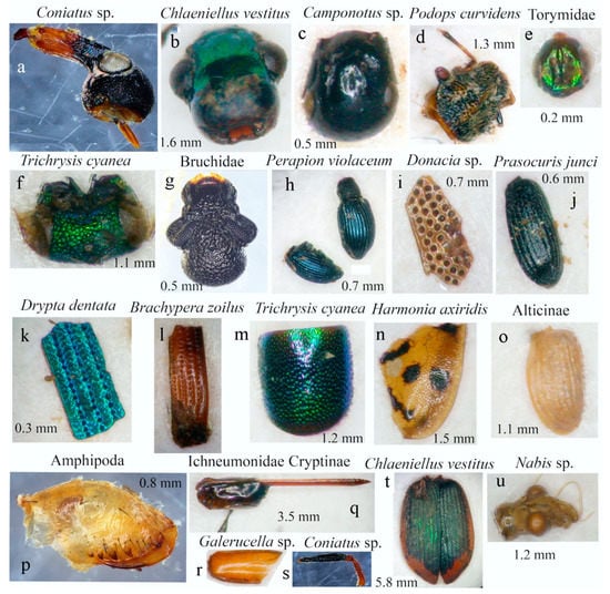 Prey found in the fecal samples of the Reed Warbler and their size: (a) Coniatus sp. (Curculionoidea, head); (b) Chlaeniellus vestitus (Carabidae, head); (c) Camponotus sp. (Formicidae, head); (d) Podops curvidens (Heteroptera, head); (e) Torymidae (Hymenoptera, head); (f) Trichrysis cyanea (Crysididae, head); (g) Bruchidae (Coleoptera, head); (h) Perapion violaceum (Apionidae, elytra and pronotum); (i) Donacia sp. (Chrysomelidae, elytra remains); (j) Prasocuris junci (Chrysomelidae, elytra); (k) Drypta dentata (Carabidae, elytra remains); (l) Brachypera zoilus (Curculionoidea, elytra remains); (m) Trichrysis cyanea (Chrysididae, abdominal segment); (n) Harmonia axiridis (Coccinellidae, elytra remains); (o) Alticinae (Chrysomelidae, elytra); (p) Talitridae? (Amphipoda, gnatopode); (q) Hymenoptera Ichneumonidae Cryptinae (ovipositor and one ovipositor sheath); (r) Galerucella sp. (Chrysomelidae, elytra remains); (s) Coniatus sp. (Curculionoidea, leg); (t) Chlaeniellus vestitus (Carabidae, elytra); (u) Nabis sp. (Heteroptera, head).