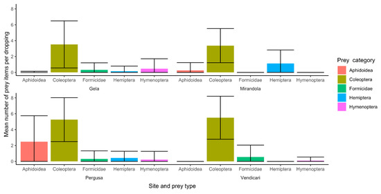 Analyses were performed with R version 4.0.3 [38]. To investigate differences in the entomological composition of Reed Warbler fecal samples, we separated six major prey types: Aphidoidea, Coleoptera, Hemiptera, Hymenoptera Formicidae, and other Hymenoptera. Other prey types (n = 10) were discarded because of their low prevalence in the dataset. We used, as dependent variables, the presence/absence of each prey type in each dropping. We fitted as fixed factors ‘site’ and ‘prey type’ (we could not fit their interaction due to rank deficiencies); ‘dropping ID’ nested within ‘site’ was fitted as random effect. Analyses were conducted with generalized linear mixed models (GLMM, package glmmADMB; [39]) with binomial distribution (logit link) and accounting for zero-inflation. We then analyzed contrasts with post hoc Tukey tests implemented with a multcomp package [40]. Two further tests were carried out with samples from the Mirandola site only; we tested whether captured arthropod composition differed between 2018 and 2019, and if 2019 droppings’ arthropod composition differed from 2019 net captures, both with Fisher’s exact test.