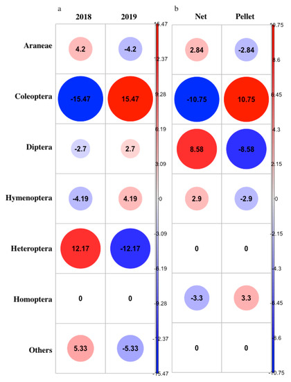 The charts show Pearson’s Standardized Residuals (numbers within the circles), obtained through χ2 test of independence on permuted dataset. Greater positive deviation from independence (positive association) is indicated with darker hues of RED; greater negative deviation from independence (negative association) is indicated with darker hues of BLUE. (a) Arthropods collected in the Mirandola breeding site of Reed Warblers in 2018 and 2019; (b) Comparison between the collection in 2019 and the prey items found in the bird droppings.
