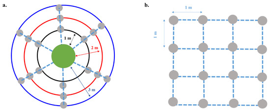 Schemes of the planting plot designs. (a) Using present A. spirorbis with the green circle representing the canopy, the target species, represented with grey circles, are planted in a radius around A. spirorbis trees at 3 different distances: the black line represents an area with 6 target species, planted at 1 m from the A. spirorbis canopy limit, the red line is at 2 m, and the blue line is at 3 m. (b) On bare soil at least 10 m away from the closest A. spirorbis, the target species, represented with grey circles, are planted in quadra of 4 plants by 4, spaced 1 m from each other.