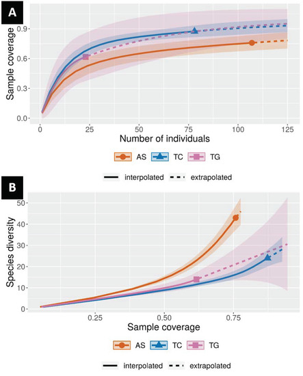Non-asymptotic approach based on interpolation and extrapolation of species diversity and sample coverage based on iNEXT online software (http://chao.stat.nthu.edu.tw, accessed on 6 July 2021) as reported by Chao et al. [44]. Solid lines represent rarefaction of the sampling curves, the observed sampling effort; dotted lines represent extrapolation of the sampling curves, based on Hill numbers for q = 0.1 and 2. (A) Sample completeness curve according to host tree species. (B) Coverage-based rarefaction and extrapolation sampling curve according to the host tree species. Legend: AS = A. spirorbis; TC = T. calobuxus; TG = T. guillainii.
