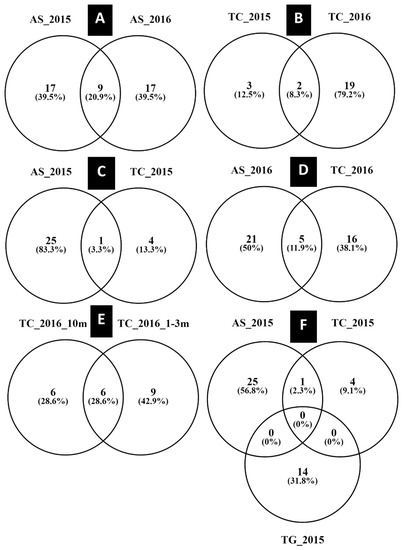 Venn diagrams of the ectomycorrhizal communities (based on OTUs) of A. spirorbis and Tristaniopsis species, in relation to host and year. Data are presented in multiple ways, as follows: (i) evolution of OTUs from 2015 to 2016 in A. spirorbis (A) and T. calobuxus (B), (ii) shared and unique OTUs between A. spirorbis and T. calobuxus in 2015 (C) and 2016 (D), (iii) shared and unique OTUs found between T. calobuxus planted inside a 3 m radius around A. spirorbis, versus T. calobuxus planted in square plots at 10 m away from A. spirorbis (E), and (iv) the shared and unique OTUs at the beginning of the experiment in 2015, between A. spirorbis, T. calobuxus, and T. guillainii (F).