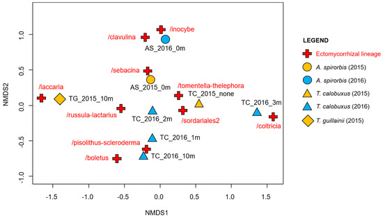 Non-metric multidimensional scaling representation of the ectomycorrhizal lineages (red cross and text) found in all samples. Hosts are symbolized as follows: A. spirorbis with circles, T. calobuxus with triangles, and T. guillainii with a diamond. Two different years of sampling (2015 and 2016) are indicated in blue and orange, respectively.
