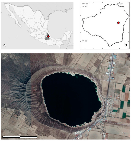 Lake Alchichica in (a) Mexico and Puebla State and (b) Oriental basin. (c) Lake Alchichica (satellite photograph from Google Earth).