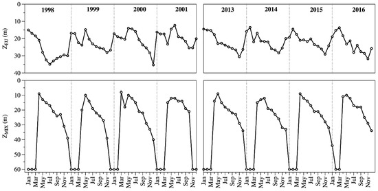 ZMIX ranged from being the whole water column (60 m) in the mixing period to eight meters (Figure 2). The ZMIX averaged 30 ± 19 m in 1998–2001 and 30 ± 18 m in 2013–2016. There was no statistical difference (p = 0.433) in the average values between both periods.