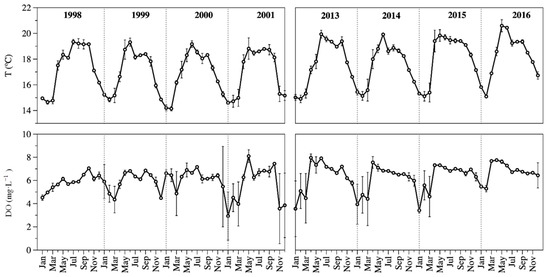 The ZMIX was well oxygenated all year round (≈6 mg L−1). The DO concentration of the ZMIX (DOMIX) was high, close to saturation. The average DOMIX concentration was 5.9 ± 1.1 mg L−1 in 1998–2001 and 6.4 ± 1.1 mg L−1 in 2013–2016. There was a statistical difference (p = 0.002) in the average DO concentration between both periods (Figure 3).
