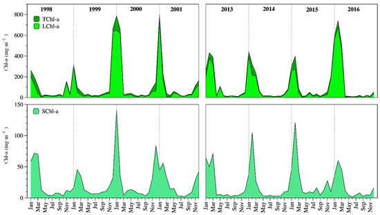 LChl-a contributed the highest percentage (≈80%) to the TChl-a concentration, while the SChl-a composed a minor percentage (≈20%). The temporal pattern of the TChl-a was similar to the large size phytoplankton fraction Chl-a (LChl-a) and the small size phytoplankton fraction (SChl-a). Average LChl-a was 96 ± 183 mg m−2 in 1998–2001 and 101 ± 162 mg m−2 in 2013–2016. Average SChl-a was 23 ± 27 mg m−2 in 1998–2001 and 20 ± 27 mg m−2 in 2013–2016 (Figure 4). There were no statistical differences in the average LChl-a (p = 0.232) or SChl-a (p = 0.081) concentrations between both periods.