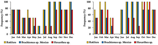 The rotifers’ appearance frequency in Lake Alchichica along the two four-years periods displayed a bimodal annual distribution curve with the lowest frequency of appearance in June (25%) and March and April (50%) in 1998–2001, and May (0%) and June (50%) in 2013–2015. Rotifer were mostly found during the mixing and early stratification period (January–April) and during the well-established and late stratification (August–December), while June (1998–2001) and May (2013–2016) showed the lowest rotifer occurrence (Figure 5). Brachionus sp. Mexico reached an average higher frequency of appearance with 70.8% (1998–2001) and 66.7% (2013–2016), while Hexarthra sp. only 54.2% in both periods.