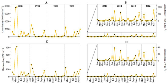 Temporal dynamics of the rotifers’ abundance (A,B) and biomass (C,D) in Lake Alchichica during 1998–2001 and 2013–2016. (An amplification of the period is presented in (B,D) to better observe the temporal variation).