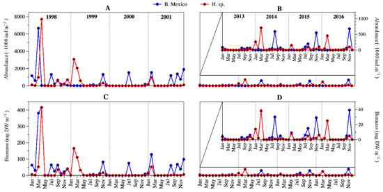 Temporal dynamics of the Brachionus sp. Mexico and Hexarthra sp. abundance (A,B) and biomass (C,D) in Lake Alchichica during 1998–2001 and 2013–2016. (An amplification of the period is presented in (B,D) to better observe the temporal variation).