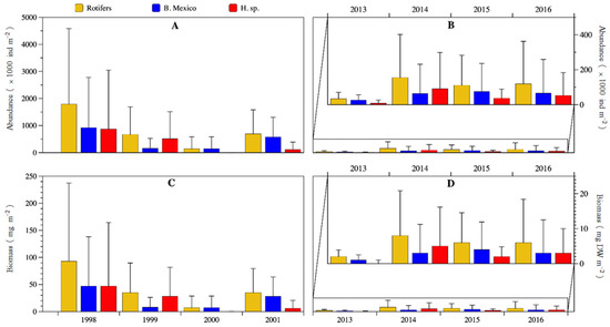 Annual average abundance (A,B) and biomass (C,D) of rotifers of Lake Alchichica during 1998–2001 and 2013–2016. (An amplification of the period is presented in (B,D) to better observe the temporal variation).