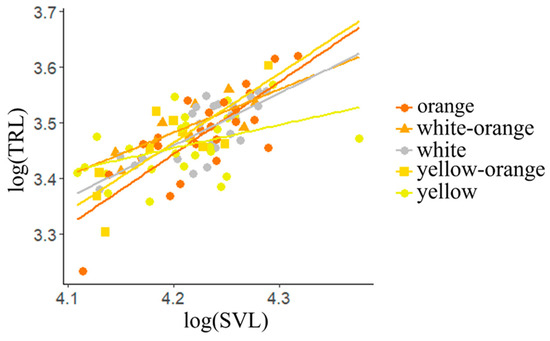 Relationship of trunk length (TRL) with snout–vent length (SVL) in the different morphs.
