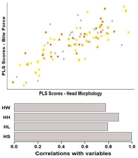 Scatterplot of individual Podarcis muralis scores obtained from partial least-squares (PLS) analysis between head morphology (head length, HL; head width, HW; head height, HH; head size, HS) and bite force. Bar plots bellow the morphology axis represent the correlations observed between that axis and bite force.