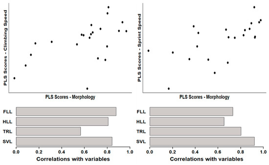 Scatterplot of individual Podarcis muralis scores obtained from partial least-squares (PLS) analysis between morphological traits (trunk length, TRL; forward limb length, FLL; hind limb length, HLL; snout-vent length, SVL) and climbing speed (left), sprint speed (right). Bar plots below each scatterplot represent the correlation observed between morphological traits and the corresponding PLS vector.