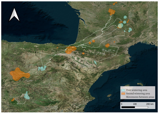 The following are available online at https://www.mdpi.com/article/10.3390/d14020117/s1, Figure S1: Wintering areas (95% KDE) used by the 44 tagged Red Kites during their non-breeding seasons in Spain and Southern France. Each color represents one wintering area, Figure S2: Comparison between individuals with one and two areas during the same wintering event based on home range size estimations (MCP, 95% KDE, 75% KDE and 50% KDE). Figure S3: Comparison between sexes based on home range size estimations (MCP, 95% KDE, 75% KDE and 50% KDE). Figure S4: Wintering areas (95% KDE) used by immatures (green) and adults (red) Red Kites during their non-breeding seasons in Spain and Southern France. Table S1: Parameters of 44 Red Kites tracked by GPS/satellite telemetry tagged in Spain during the wintering season. Sex (F: female, M: male) and Age (A: adult, I: immature) are indicated together with bird ID. The wintering province in Spain and the summer destination after the spring migration are also shown. A hyphen (-) in-dicates that information is not available. Italics on dates indicate that they correspond to the be-ginning/end of measuring, not to beginning/end of wintering, so those were considered as “partial” winterings.