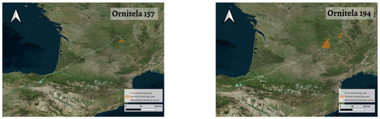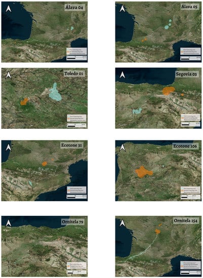 The home range sizes varied greatly between individuals. This variability was also found in the booted eagle in Africa [9], which showed 95% kernels of 398 km2, 75% kernels of 132 km2 and 50% kernels of 72 km2, considerably smaller than in the case of the red kites observed in the current study. On the other hand, Aquila pomarina, a species that also overwinters in Africa, showed larger overall wintering home ranges (up to 112,000 km2) [41]. This intraspecific variability may be explained by the possibility of expanding or restricting the range area depending on the availability of food and resources, as well as by the geographical and biological characteristics of the territory selected by the individual. Furthermore, the changes could also be due to the physiological state of the individual, especially when they are infected by parasites or affected by pollutants [21,42]. Interspecific differences, on the other hand, may also be due to the particularities of the territory selected by the species during wintering and, above all, its biological capabilities and ecological requirements (amount of food required, fat storage capacity, feeding efficiency, etc.) [2].