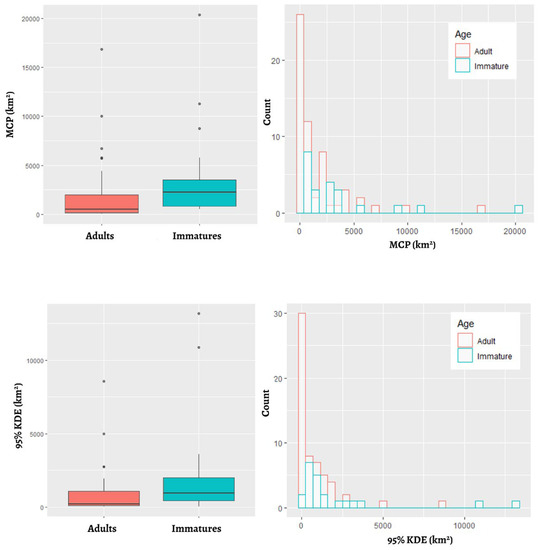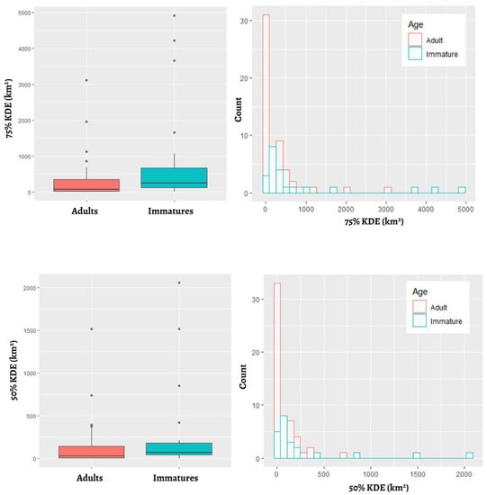 Comparison between age (immatures/adults) based on home range size estimations (MCP, 95% KDE, 75% KDE and 50% KDE). Boxplots are shown on the left (horizontal line—median; vertical line—minimum and maximum values without outliers; points—outliers). Histograms are shown on the right.