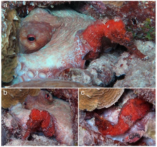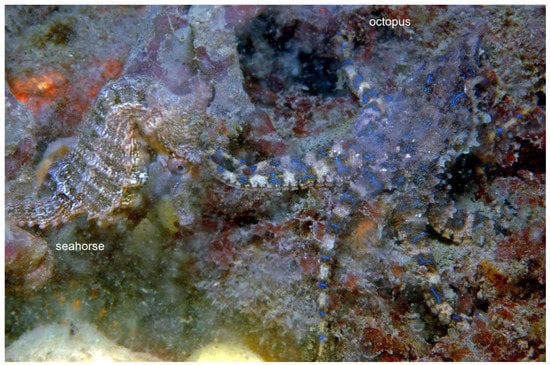 Seahorse predation by cephalopods is not well documented; for instance, it is not mentioned in an overview of seahorse predators in a review by Foster and Vincent []. Octopuses as seahorse predators have so far only been reported from Portugal [] and New South Wales, Australia []. These cephalopods are well known to be voracious predators, especially of molluscs and crustaceans [,], but also of slow-moving fishes such as scorpionfish and lionfish, which use venom as a defence weapon [,,]. Owing to their upright position and use of camouflage, seahorses are also not expected to rely much on swimming as a means to escape from predation. Considering that octopuses can even break the shells of molluscs and the carapaces of crustaceans, it is not surprising that they are able to consume seahorses, whose protection by bony plates may turn out to be ineffective. In the present report, we present photographic evidence of attacks on seahorse species by octopuses.