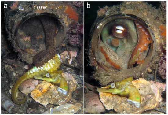 - Bennice, C.O.; Brooks, W.R.; Hanlon, R.T. Behavioral dynamics provide insight into resource exploitation and habitat coexistence of two octopus species in a shallow Florida lagoon. J. Exp. Mar. Biol. Ecol. 2021, 542–543, 151592. [Google Scholar] [CrossRef]