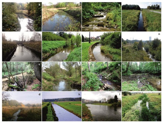 Photos of the sampling sites. (a) upper course of the Bolina River, (b) lower course of the Bolina River, (c) upper course of the Centuria River, (d) lower course of the Centuria River, (e) upper course of the Mitręga River, (f) lower course of the Mitręga River, (g) upper course of the Mleczna River, (h) lower course of the Mleczna River, (i) upper course of the Dziechcinka River, (j) lower course of the Dziechcinka River, (k) upper course of the Vistula River, (l) lower course of the Vistula River, (m) upper course of the Korzenica River, (n) lower course of the Korzenica River, (o) upper course of the Wiercica River, (p) lower course of the Wiercica River.