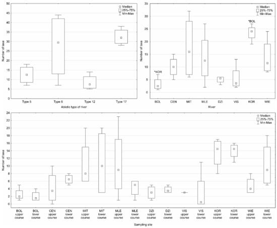 Box-and-whisker plot showing the number of rotifer taxa in the abiotic types of rivers, in the rivers and at the sampling sites (asterisks above a whisker denote significant differences between the rivers, p < 0.05). Abbreviations as in Table 1.