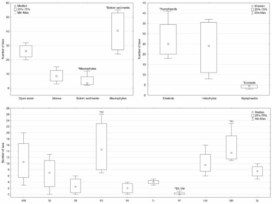 Box-and-whisker plot showing species richness in the different microhabitats (asterisks above a whisker denote significant differences among the rivers, p < 0.05). Abbreviations: AM—Amphibious; DI—Diatoms; EB—Emergent broad-leaved; ER—Emergent reeds, sedges; FA—Filamentous algae; FL—Floating-leaved (rooted); FF—Free-floating; LM—Liverworts and mosses; SM—Submerged broad-leaved; SL—Submerged linear-leave.