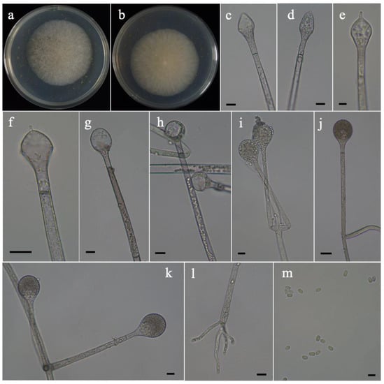 Morphologies of Absidia frigida ex-holotype CGMCC 3.16201. (a,b) Colonies on MEA, (a) obverse, (b) reverse; (c–h) columellae and projection; (i–k) sporangium; (l) rhizoids; (m) sporangiospores. Scale bars: (c–l) 10 μm, (m) 5 μm.