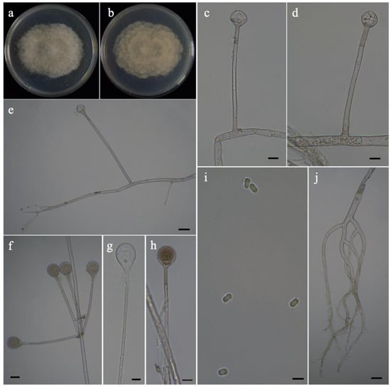 Morphologies of Absidia longissima ex-holotype CGMCC 3.16203. (a,b) Colonies on MEA,(a) obverse, (b) reverse; (c), (d) columellae and projection; (e) sporangiophores arising from stolons borne on rhizoids; (f–h) sporangium or sporangia; (i) sporangiospores; (j) rhizoids. Scale bars: (c,d,g,h) 10 μm, (e,f,j) 20 μm, (i) 5 μm.